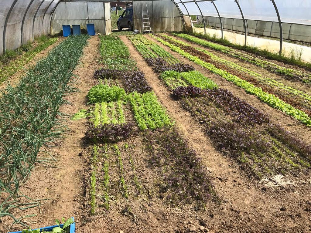 Et qu’est-ce qu’on trouve au marché et dans les paniers justement? Cette année, Nicolas a 70 a de légumes plein champ où poussent pommes de terre, oignons, carottes, courges, courgettes, pâtissons, cornichons, melons, pois croquants, etc. Il a également 800 m2 sous tunnel pour les salades d’hiver (doucette et scarole) et pour les tomates, aubergines, poivrons, concombres, salade à tondre, radis et plusieurs plantes aromatiques le reste de l’année. Les fruits sont également à la fête sur cette exploitation avec 20 a intensifs d’arbres fruitiers et environ 140 arbres haute tige. On trouve des pommes, des poires, des prunes, des pruneaux, des noix et des cerises. « Tout ce qui pousse chez nous. Ce que je n’ai pas, ce sont les pêches et abricots parce que ça ne marche pas très bien. J’ai essayé, mais sans succès », dit Nicolas en rigolant.
