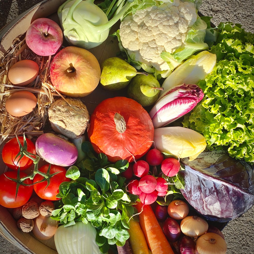 « Tout ce qui pousse chez nous. Ce que je n’ai pas ce sont les pêches et les abricots. J‘ai essayé mais sans succès. » 🙃 Ce que nous ne pouvons pas produire, nous l’achetons à des producteurs de la région, pour vous proposer un assortiment de fruits et légumes divers et varié au fil des saisons.